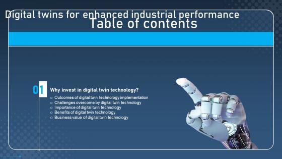 Slidegeeks is one of the best resources for PowerPoint templates. You can download easily and regulate Table Of Contents Digital Twins For Enhanced Industrial Performance Graphics Pdf for your personal presentations from our wonderful collection. A few clicks is all it takes to discover and get the most relevant and appropriate templates. Use our Templates to add a unique zing and appeal to your presentation and meetings. All the slides are easy to edit and you can use them even for advertisement purposes. Our Table Of Contents Digital Twins For Enhanced Industrial Performance Graphics Pdf are topically designed to provide an attractive backdrop to any subject. Use them to look like a presentation pro.