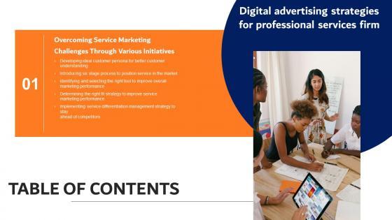 Do you have an important presentation coming up Are you looking for something that will make your presentation stand out from the rest Look no further than Digital Advertising Strategies For Professional Services Firm Table Of Contents Pictures Pdf. With our professional designs, you can trust that your presentation will pop and make delivering it a smooth process. And with Slidegeeks, you can trust that your presentation will be unique and memorable. So why wait Grab Digital Advertising Strategies For Professional Services Firm Table Of Contents Pictures Pdf today and make your presentation stand out from the rest. Our Digital Advertising Strategies For Professional Services Firm Table Of Contents Pictures Pdf are topically designed to provide an attractive backdrop to any subject. Use them to look like a presentation pro.