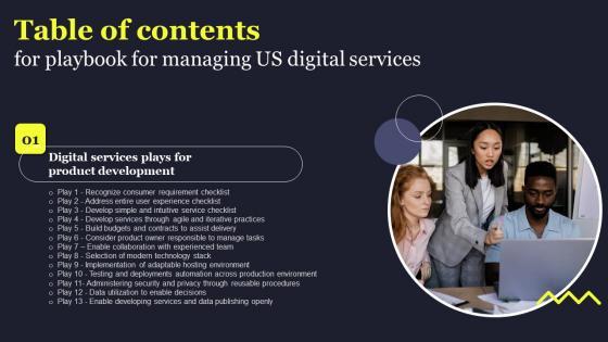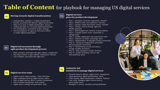 Slidegeeks is one of the best resources for PowerPoint templates. You can download easily and regulate Table Of Contents Playbook For Advancing Technology Through Digital Services Elements PDF for your personal presentations from our wonderful collection. A few clicks is all it takes to discover and get the most relevant and appropriate templates. Use our Templates to add a unique zing and appeal to your presentation and meetings. All the slides are easy to edit and you can use them even for advertisement purposes.