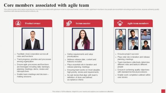 This slide provides information regarding key members associated with agile team in terms of product owner, scrum master, agile team members. Key people are essential in ensuring project success, assures achieving quality objectives with standard technical procedures, etc. If your project calls for a presentation, then Slidegeeks is your go-to partner because we have professionally designed, easy-to-edit templates that are perfect for any presentation. After downloading, you can easily edit Core Members Associated With Agile Team Public Sector Digital Solutions Template Pdf and make the changes accordingly. You can rearrange slides or fill them with different images. Check out all the handy templates This slide provides information regarding key members associated with agile team in terms of product owner, scrum master, agile team members. Key people are essential in ensuring project success, assures achieving quality objectives with standard technical procedures, etc.