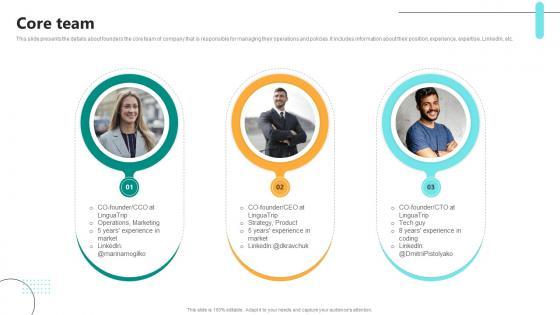 This slide presents the details about founders the core team of company that is responsible for managing their operations and policies. It includes information about their position, experience, expertise, LinkedIn, etc. There are so many reasons you need a Core Team Digital Language Learning Solution Pitch Deck. The first reason is you can not spend time making everything from scratch, Thus, Slidegeeks has made presentation templates for you too. You can easily download these templates from our website easily. This slide presents the details about founders the core team of company that is responsible for managing their operations and policies. It includes information about their position, experience, expertise, LinkedIn, etc.