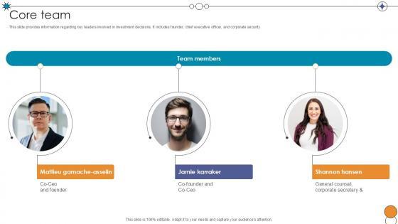 This slide provides information regarding key leaders involved in investment decisions. It includes founder, chief executive officer, and corporate security. Here you can discover an assortment of the finest PowerPoint and Google Slides templates. With these templates, you can create presentations for a variety of purposes while simultaneously providing your audience with an eye-catching visual experience. Download Core Team Digital Pharmacy Company Investor Funding Ppt Example to deliver an impeccable presentation. These templates will make your job of preparing presentations much quicker, yet still, maintain a high level of quality. Slidegeeks has experienced researchers who prepare these templates and write high-quality content for you. Later on, you can personalize the content by editing the Core Team Digital Pharmacy Company Investor Funding Ppt Example. This slide provides information regarding key leaders involved in investment decisions. It includes founder, chief executive officer, and corporate security.