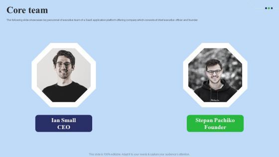 The following slide showcases key personnel of executive team of a SaaS application platform offering company which consists of chief executive officer and founder Take your projects to the next level with our ultimate collection of Core Team Fundraising Pitch Deck For Digital Software Company Clipart Pdf. Slidegeeks has designed a range of layouts that are perfect for representing task or activity duration, keeping track of all your deadlines at a glance. Tailor these designs to your exact needs and give them a truly corporate look with your own brand colors they will make your projects stand out from the rest The following slide showcases key personnel of executive team of a SaaS application platform offering company which consists of chief executive officer and founder