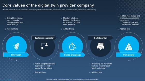 This slide represents the core values of the our company, which include innovation, customer obsession, a sense of urgency, collaboration, and community. Slidegeeks is here to make your presentations a breeze with Digital Twin Tech IT Core Values Of The Digital Twin Provider Company Portrait PDF With our easy-to-use and customizable templates, you can focus on delivering your ideas rather than worrying about formatting. With a variety of designs to choose from, youre sure to find one that suits your needs. And with animations and unique photos, illustrations, and fonts, you can make your presentation pop. So whether youre giving a sales pitch or presenting to the board, make sure to check out Slidegeeks first.