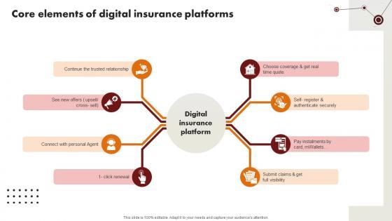 Are you in need of a template that can accommodate all of your creative concepts This one is crafted professionally and can be altered to fit any style. Use it with Google Slides or PowerPoint. Include striking photographs, symbols, depictions, and other visuals. Fill, move around, or remove text boxes as desired. Test out color palettes and font mixtures. Edit and save your work, or work with colleagues. Download Technology Trends In Online Insurance Core Elements Of Digital Insurance Platforms and observe how to make your presentation outstanding. Give an impeccable presentation to your group and make your presentation unforgettable. Our Technology Trends In Online Insurance Core Elements Of Digital Insurance Platforms are topically designed to provide an attractive backdrop to any subject. Use them to look like a presentation pro.