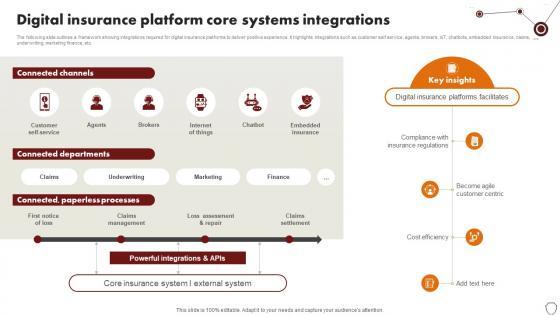 The following slide outlines a framework showing integrations required for digital insurance platforms to deliver positive experience. It highlights integrations such as customer self service, agents, brokers, IoT, chatbots, embedded insurance, claims, underwriting, marketing finance, etc. This modern and well-arranged Technology Trends In Online Insurance Digital Insurance Platform Core Systems Integrations provides lots of creative possibilities. It is very simple to customize and edit with the Powerpoint Software. Just drag and drop your pictures into the shapes. All facets of this template can be edited with Powerpoint, no extra software is necessary. Add your own material, put your images in the places assigned for them, adjust the colors, and then you can show your slides to the world, with an animated slide included. The following slide outlines a framework showing integrations required for digital insurance platforms to deliver positive experience. It highlights integrations such as customer self service, agents, brokers, IoT, chatbots, embedded insurance, claims, underwriting, marketing finance, etc.