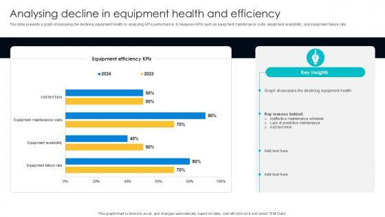 This slide presents a graph showcasing the declining equipment health by analysing KPIs performance. It measures KPIs such as equipment maintenance costs, equipment availability, and equipment failure rate. Slidegeeks is one of the best resources for PowerPoint templates. You can download easily and regulate Analysing Decline In Equipment Digital Transformation Journey PPT Sample DT SS V for your personal presentations from our wonderful collection. A few clicks is all it takes to discover and get the most relevant and appropriate templates. Use our Templates to add a unique zing and appeal to your presentation and meetings. All the slides are easy to edit and you can use them even for advertisement purposes. This slide presents a graph showcasing the declining equipment health by analysing KPIs performance. It measures KPIs such as equipment maintenance costs, equipment availability, and equipment failure rate.