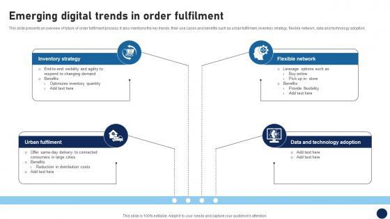 This slide presents an overview of future of order fulfilment process. It also mentions the key trends, their use cases and benefits such as urban fulfilment, inventory strategy, flexible network, data and technology adoption. The Emerging Digital Trends In Order Fulfilment Optimizing Retail Operations With Digital DT SS V is a compilation of the most recent design trends as a series of slides. It is suitable for any subject or industry presentation, containing attractive visuals and photo spots for businesses to clearly express their messages. This template contains a variety of slides for the user to input data, such as structures to contrast two elements, bullet points, and slides for written information. Slidegeeks is prepared to create an impression. This slide presents an overview of future of order fulfilment process. It also mentions the key trends, their use cases and benefits such as urban fulfilment, inventory strategy, flexible network, data and technology adoption.