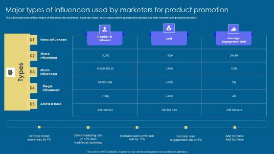 This slide represents different types of influencers for promotion. It includes Nano, micro, macro and mega influencers that are used by marketers for product promotion. The Implementation Of Digital Marketing Major Types Of Influencers Used By Marketers Pictures PDF is a compilation of the most recent design trends as a series of slides. It is suitable for any subject or industry presentation, containing attractive visuals and photo spots for businesses to clearly express their messages. This template contains a variety of slides for the user to input data, such as structures to contrast two elements, bullet points, and slides for written information. Slidegeeks is prepared to create an impression.