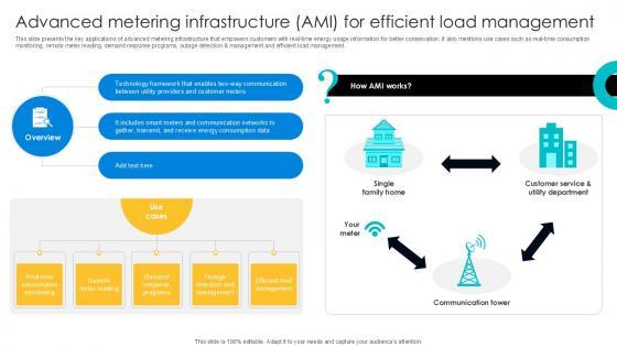 This slide presents the key applications of advanced metering infrastructure that empowers customers with real-time energy usage information for better conservation. It also mentions use cases such as real-time consumption monitoring, remote meter reading, demand response programs, outage detection and management and efficient load management. Boost your pitch with our creative Advanced Metering Infrastructure Digital Transformation Journey PPT Slide DT SS V. Deliver an awe-inspiring pitch that will mesmerize everyone. Using these presentation templates you will surely catch everyones attention. You can browse the ppts collection on our website. We have researchers who are experts at creating the right content for the templates. So you do not have to invest time in any additional work. Just grab the template now and use them. This slide presents the key applications of advanced metering infrastructure that empowers customers with real-time energy usage information for better conservation. It also mentions use cases such as real-time consumption monitoring, remote meter reading, demand response programs, outage detection and management and efficient load management.