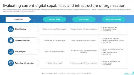 This slide presents a strategy for assessing organizations existing digital capabilities and infrastructure to ensure successful digitization and ERP integration. It includes assessment of capabilities such as digital strategy, customer experience, data analytics and technology infrastructure. Find a pre-designed and impeccable Evaluating Current Digital Capabilities And Infrastructure Erp And Digital Transformation For Maximizing DT SS V. The templates can ace your presentation without additional effort. You can download these easy-to-edit presentation templates to make your presentation stand out from others. So, what are you waiting for Download the template from Slidegeeks today and give a unique touch to your presentation. This slide presents a strategy for assessing organizations existing digital capabilities and infrastructure to ensure successful digitization and ERP integration. It includes assessment of capabilities such as digital strategy, customer experience, data analytics and technology infrastructure.