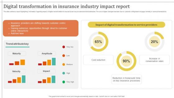 The slide outlines a report highlighting information regarding impact of digital transformation to insurance service providers and trend attributes. The lure of digital changes has been due to customer willingness to engage remotely in serious transactions. This Technology Trends In Online Insurance Digital Transformation In Insurance Industry Impact Report is perfect for any presentation, be it in front of clients or colleagues. It is a versatile and stylish solution for organizing your meetings. The Technology Trends In Online Insurance Digital Transformation In Insurance Industry Impact Report features a modern design for your presentation meetings. The adjustable and customizable slides provide unlimited possibilities for acing up your presentation. Slidegeeks has done all the homework before launching the product for you. So, do not wait, grab the presentation templates today The slide outlines a report highlighting information regarding impact of digital transformation to insurance service providers and trend attributes. The lure of digital changes has been due to customer willingness to engage remotely in serious transactions.