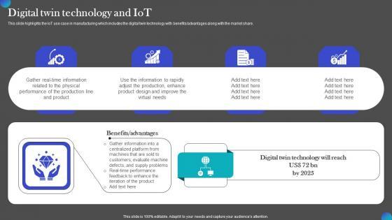 This slide highlights the IoT use case in manufacturing which includes the digital twin technology with benefits advantages along with the market share. Welcome to our selection of the Iot Applications For Manufacturing Industry Digital Twin Technology And Iot Ideas PDF. These are designed to help you showcase your creativity and bring your sphere to life. Planning and Innovation are essential for any business that is just starting out. This collection contains the designs that you need for your everyday presentations. All of our PowerPoints are 100 percent editable, so you can customize them to suit your needs. This multi purpose template can be used in various situations. Grab these presentation templates today.