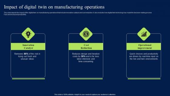 This slide depicts the impact of the digital twin on manufacturing operations that include innovation catalyst and cost reduction. It also includes how digital twin technology has made the decision-making process fast and increased productivity. Whether you have daily or monthly meetings, a brilliant presentation is necessary. Impact Of Digital Twin On Manufacturing Operations Themes PDF can be your best option for delivering a presentation. Represent everything in detail using Impact Of Digital Twin On Manufacturing Operations Themes PDF and make yourself stand out in meetings. The template is versatile and follows a structure that will cater to your requirements. All the templates prepared by Slidegeeks are easy to download and edit. Our research experts have taken care of the corporate themes as well. So, give it a try and see the results. This slide depicts the impact of the digital twin on manufacturing operations that include innovation catalyst and cost reduction. It also includes how digital twin technology has made the decision-making process Fast and increased productivity.