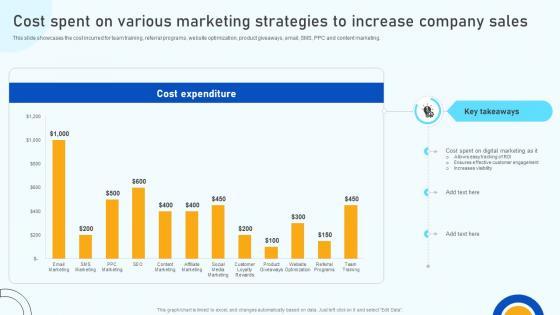 This slide showcases the cost incurred for team training, referral programs, website optimization, product giveaways, email, SMS, PPC and content marketing. Do you have to make sure that everyone on your team knows about any specific topic I yes, then you should give Digital Marketing Strategies Cost Spent On Various Marketing Strategies To Increase SA SS V a try. Our experts have put a lot of knowledge and effort into creating this impeccable Digital Marketing Strategies Cost Spent On Various Marketing Strategies To Increase SA SS V. You can use this template for your upcoming presentations, as the slides are perfect to represent even the tiniest detail. You can download these templates from the Slidegeeks website and these are easy to edit. So grab these today This slide showcases the cost incurred for team training, referral programs, website optimization, product giveaways, email, SMS, PPC and content marketing.