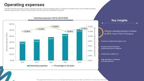 This slide showcases aerospace company operating expenses in US and operating margin. It includes key elements such as yearly operating expenses, operating expenses split by research and development and selling, general and administrative expenses. The Operating Expenses Digital Marketings Strategies PPT Presentation CP SS V is a compilation of the most recent design trends as a series of slides. It is suitable for any subject or industry presentation, containing attractive visuals and photo spots for businesses to clearly express their messages. This template contains a variety of slides for the user to input data, such as structures to contrast two elements, bullet points, and slides for written information. Slidegeeks is prepared to create an impression. This slide showcases aerospace company operating expenses in US and operating margin. It includes key elements such as yearly operating expenses, operating expenses split by research and development and selling, general and administrative expenses.