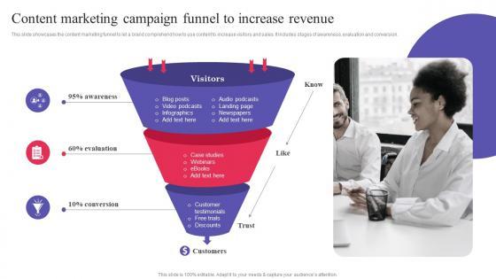 This slide showcases the content marketing funnel to let a brand comprehend how to use content to increase visitors and sales. It includes stages of awareness, evaluation and conversion. Slidegeeks is here to make your presentations a breeze with Content Marketing Campaign Funnel To Increase Revenue Digital Promotional Campaign Portrait Pdf With our easy-to-use and customizable templates, you can focus on delivering your ideas rather than worrying about formatting. With a variety of designs to choose from, you are sure to find one that suits your needs. And with animations and unique photos, illustrations, and fonts, you can make your presentation pop. So whether you are giving a sales pitch or presenting to the board, make sure to check out Slidegeeks first. This slide showcases the content marketing funnel to let a brand comprehend how to use content to increase visitors and sales. It includes stages of awareness, evaluation and conversion.