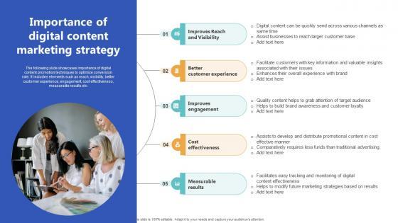 The following slide showcases importance of digital content promotion techniques to optimize conversion rate. It includes elements such as reach, visibility, better customer experience, engagement, cost effectiveness, measurable results etc. Coming up with a presentation necessitates that the majority of the effort goes into the content and the message you intend to convey. The visuals of a PowerPoint presentation can only be effective if it supplements and supports the story that is being told. Keeping this in mind our experts created Importance Of Digital Content Marketing Strategy Top Of The Funnel Digital Content Strategy SS V to reduce the time that goes into designing the presentation. This way, you can concentrate on the message while our designers take care of providing you with the right template for the situation. The following slide showcases importance of digital content promotion techniques to optimize conversion rate. It includes elements such as reach, visibility, better customer experience, engagement, cost effectiveness, measurable results etc.