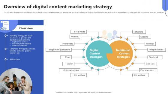 The following slide presents brief introduction of digital content marketing strategy to resolve user problem by offering related solution. It includes elements such as new audience, greater credibility, more leads, webinars, emails etc. This Overview Of Digital Content Marketing Strategy Top Of The Funnel Digital Content Strategy SS V from Slidegeeks makes it easy to present information on your topic with precision. It provides customization options, so you can make changes to the colors, design, graphics, or any other component to create a unique layout. It is also available for immediate download, so you can begin using it right away. Slidegeeks has done good research to ensure that you have everything you need to make your presentation stand out. Make a name out there for a brilliant performance. The following slide presents brief introduction of digital content marketing strategy to resolve user problem by offering related solution. It includes elements such as new audience, greater credibility, more leads, webinars, emails etc.
