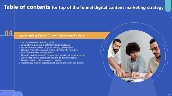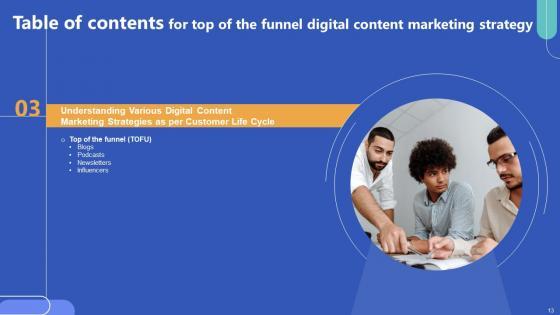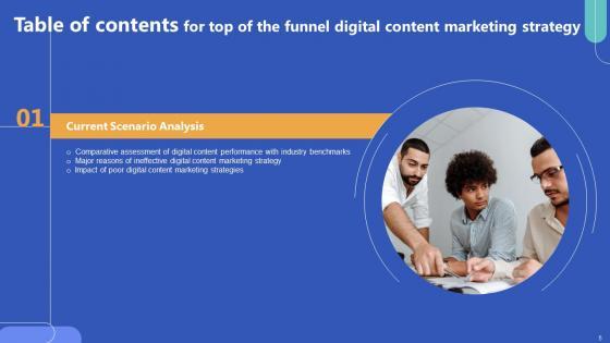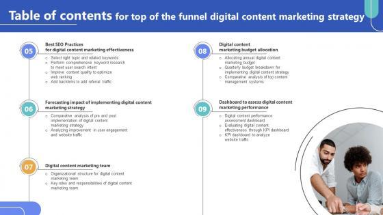 Retrieve professionally designed Table Of Contents Top Of The Funnel Digital Content Marketing Strategy SS V to effectively convey your message and captivate your listeners. Save time by selecting pre-made slideshows that are appropriate for various topics, from business to educational purposes. These themes come in many different styles, from creative to corporate, and all of them are easily adjustable and can be edited quickly. Access them as PowerPoint templates or as Google Slides themes. You do not have to go on a hunt for the perfect presentation because Slidegeeks got you covered from everywhere. Our Table Of Contents Top Of The Funnel Digital Content Marketing Strategy SS V are topically designed to provide an attractive backdrop to any subject. Use them to look like a presentation pro.