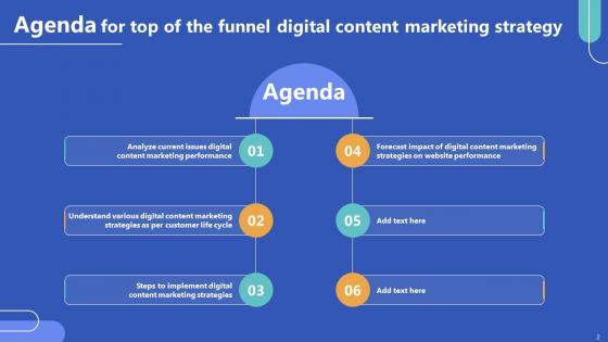 Boost your pitch with our creative Agenda For Top Of The Funnel Digital Content Marketing Strategy SS V. Deliver an awe-inspiring pitch that will mesmerize everyone. Using these presentation templates you will surely catch everyones attention. You can browse the ppts collection on our website. We have researchers who are experts at creating the right content for the templates. So you do not have to invest time in any additional work. Just grab the template now and use them. Our Agenda For Top Of The Funnel Digital Content Marketing Strategy SS V are topically designed to provide an attractive backdrop to any subject. Use them to look like a presentation pro.
