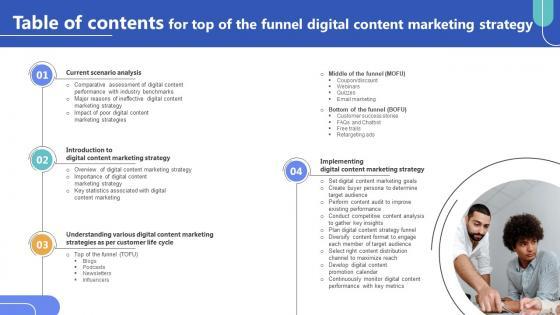 Are you searching for a Table Of Contents For Top Of The Funnel Digital Content Marketing Strategy SS V that is uncluttered, straightforward, and original Its easy to edit, and you can change the colors to suit your personal or business branding. For a presentation that expresses how much effort you have put in, this template is ideal With all of its features, including tables, diagrams, statistics, and lists, its perfect for a business plan presentation. Make your ideas more appealing with these professional slides. Download NNNNNNNNNNNNNNNNNNNNNNNNNNNNNNN from Slidegeeks today. Our Table Of Contents For Top Of The Funnel Digital Content Marketing Strategy SS V are topically designed to provide an attractive backdrop to any subject. Use them to look like a presentation pro.