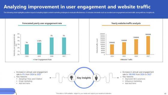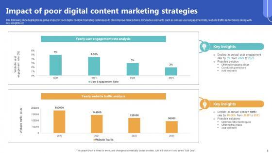 The following slide highlights negative impact of poor digital content marketing techniques to plan improvement actions. It includes elements such as annual user engagement rate, website traffic performance along with key insights etc. Formulating a presentation can take up a lot of effort and time, so the content and message should always be the primary focus. The visuals of the PowerPoint can enhance the presenters message, so our Impact Of Poor Digital Content Marketing Strategies Top Of The Funnel Digital Content Strategy SS V was created to help save time. Instead of worrying about the design, the presenter can concentrate on the message while our designers work on creating the ideal templates for whatever situation is needed. Slidegeeks has experts for everything from amazing designs to valuable content, we have put everything into Impact Of Poor Digital Content Marketing Strategies Top Of The Funnel Digital Content Strategy SS V The following slide highlights negative impact of poor digital content marketing techniques to plan improvement actions. It includes elements such as annual user engagement rate, website traffic performance along with key insights etc.