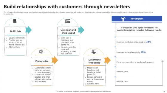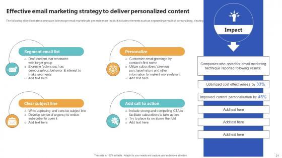 The following slide illustrates some ways to leverage email marketing to generate more leads. It includes elements such as segmenting email list, personalizing, clearing subject line, adding call to action etc. Are you in need of a template that can accommodate all of your creative concepts This one is crafted professionally and can be altered to fit any style. Use it with Google Slides or PowerPoint. Include striking photographs, symbols, depictions, and other visuals. Fill, move around, or remove text boxes as desired. Test out color palettes and font mixtures. Edit and save your work, or work with colleagues. Download Effective Email Marketing Strategy To Deliver Top Of The Funnel Digital Content Strategy SS V and observe how to make your presentation outstanding. Give an impeccable presentation to your group and make your presentation unforgettable. The following slide illustrates some ways to leverage email marketing to generate more leads. It includes elements such as segmenting email list, personalizing, clearing subject line, adding call to action etc.