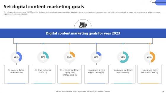 The following slide depicts some SMART goals for digital content marketing to organize activities. It includes elements such as brand awareness, business traffic, customer loyalty, engagement, search engine ranking, consumer experience, more leads, sales etc. The best PPT templates are a great way to save time, energy, and resources. Slidegeeks have 100 percent editable powerpoint slides making them incredibly versatile. With these quality presentation templates, you can create a captivating and memorable presentation by combining visually appealing slides and effectively communicating your message. Download Set Digital Content Marketing Goals Top Of The Funnel Digital Content Strategy SS V from Slidegeeks and deliver a wonderful presentation. The following slide depicts some SMART goals for digital content marketing to organize activities. It includes elements such as brand awareness, business traffic, customer loyalty, engagement, search engine ranking, consumer experience, more leads, sales etc.