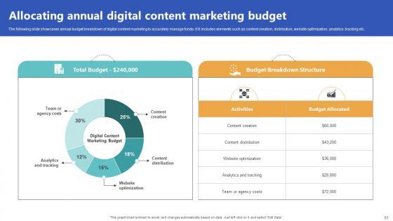 The following slide showcases annual budget breakdown of digital content marketing to accurately manage funds. It It includes elements such as content creation, distribution, website optimization, analytics, tracking etc. Create an editable Allocating Annual Digital Content Marketing Top Of The Funnel Digital Content Strategy SS V that communicates your idea and engages your audience. Whether you are presenting a business or an educational presentation, pre-designed presentation templates help save time. Allocating Annual Digital Content Marketing Top Of The Funnel Digital Content Strategy SS V is highly customizable and very easy to edit, covering many different styles from creative to business presentations. Slidegeeks has creative team members who have crafted amazing templates. So, go and get them without any delay. The following slide showcases annual budget breakdown of digital content marketing to accurately manage funds. It It includes elements such as content creation, distribution, website optimization, analytics, tracking etc.