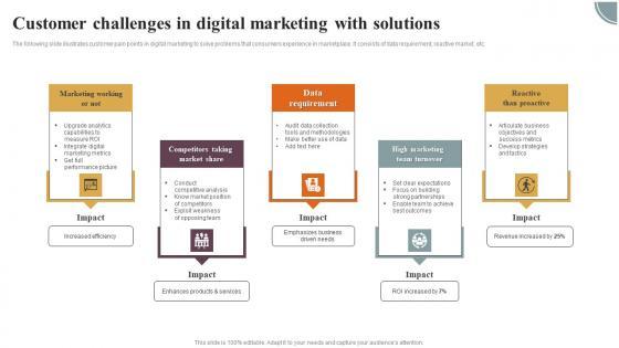 The following slide illustrates customer pain points in digital marketing to solve problems that consumers experience in marketplace. It consists of data requirement, reactive market, etc. Pitch your topic with ease and precision using this Customer Challenges In Digital Marketing With Solutions Diagrams Pdf This layout presents information on Marketing Working, Competitors Taking, Market Share It is also available for immediate download and adjustment. So, changes can be made in the color, design, graphics or any other component to create a unique layout. The following slide illustrates customer pain points in digital marketing to solve problems that consumers experience in marketplace. It consists of data requirement, reactive market, etc.