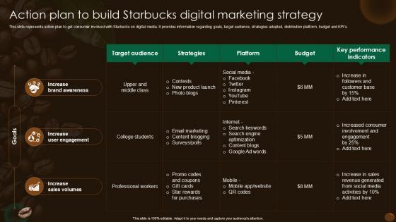 This slide represents action plan to get consumer involved with Starbucks on digital media. It provides information regarding goals, target audience, strategies adopted, distribution platform, budget and KPIs. Find a pre-designed and impeccable Action Plan To Build Starbucks Digital Marketing Strategy Ppt Template SS. The templates can ace your presentation without additional effort. You can download these easy-to-edit presentation templates to make your presentation stand out from others. So, what are you waiting for Download the template from Slidegeeks today and give a unique touch to your presentation. This slide represents action plan to get consumer involved with Starbucks on digital media. It provides information regarding goals, target audience, strategies adopted, distribution platform, budget and KPIs.