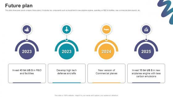 This slide showcases about company future plans. It includes key components such as investment in new airplane engines, spending on RandD and facilities, new commercial plane launch, etc. If you are looking for a format to display your unique thoughts, then the professionally designed Future Plan Digital Marketings Strategies PPT Presentation CP SS V is the one for you. You can use it as a Google Slides template or a PowerPoint template. Incorporate impressive visuals, symbols, images, and other charts. Modify or reorganize the text boxes as you desire. Experiment with shade schemes and font pairings. Alter, share or cooperate with other people on your work. Download Future Plan Digital Marketings Strategies PPT Presentation CP SS V and find out how to give a successful presentation. Present a perfect display to your team and make your presentation unforgettable. This slide showcases about company future plans. It includes key components such as investment in new airplane engines, spending on RandD and facilities, new commercial plane launch, etc.