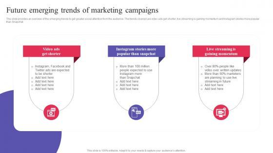 This slide provides an overview of the emerging trends to get greater social attention from the audience. The trends covered are video ads get shorter, live streaming is gaining momentum and Instagram stories more popular than Snapchat. Crafting an eye-catching presentation has never been more straightforward. Let your presentation shine with this tasteful yet straightforward Future Emerging Trends Of Marketing Campaigns Digital Promotional Campaign Infographics Pdf template. It offers a minimalistic and classy look that is great for making a statement. The colors have been employed intelligently to add a bit of playfulness while still remaining professional. Construct the ideal Future Emerging Trends Of Marketing Campaigns Digital Promotional Campaign Infographics Pdf that effortlessly grabs the attention of your audience. Begin now and be certain to wow your customers. This slide provides an overview of the emerging trends to get greater social attention from the audience. The trends covered are video ads get shorter, live streaming is gaining momentum and Instagram stories more popular than Snapchat.
