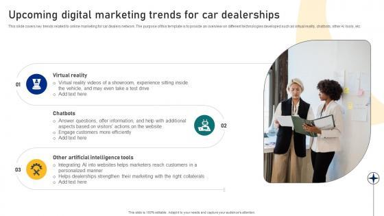 This slide covers key trends related to online marketing for car dealers network. The purpose of this template is to provide an overview on different technologies developed such as virtual reality, chatbots, other AI tools, etc. Do you have an important presentation coming up Are you looking for something that will make your presentation stand out from the rest Look no further than Ultimate Guide To Developing Upcoming Digital Marketing Trends For Car Dealerships Strategy SS V. With our professional designs, you can trust that your presentation will pop and make delivering it a smooth process. And with Slidegeeks, you can trust that your presentation will be unique and memorable. So why wait Grab Ultimate Guide To Developing Upcoming Digital Marketing Trends For Car Dealerships Strategy SS V today and make your presentation stand out from the rest This slide covers key trends related to online marketing for car dealers network. The purpose of this template is to provide an overview on different technologies developed such as virtual reality, chatbots, other AI tools, etc.