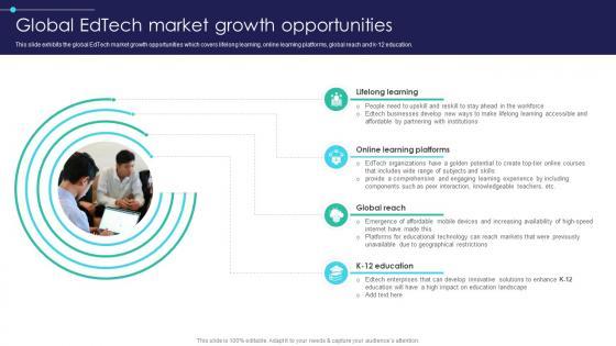 This slide exhibits the global EdTech market growth opportunities which covers lifelong learning, online learning platforms, global reach and k-12 education. Make sure to capture your audiences attention in your business displays with our gratis customizable Global Digital Education Global Edtech Market Growth Opportunities IR SS V. These are great for business strategies, office conferences, capital raising or task suggestions. If you desire to acquire more customers for your tech business and ensure they stay satisfied, create your own sales presentation with these plain slides. This slide exhibits the global EdTech market growth opportunities which covers lifelong learning, online learning platforms, global reach and k-12 education.