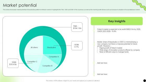 This slide showcases market potential of bluestudios platform in fintech market. It highlights the TAM, SOM and SAM of the business, as well as the market growth drivers such as increase in adoption of nosql database market. If you are looking for a format to display your unique thoughts, then the professionally designed Market Potential Digital Payment Platform Pitch Deck is the one for you. You can use it as a Google Slides template or a PowerPoint template. Incorporate impressive visuals, symbols, images, and other charts. Modify or reorganize the text boxes as you desire. Experiment with shade schemes and font pairings. Alter, share or cooperate with other people on your work. Download Market Potential Digital Payment Platform Pitch Deck and find out how to give a successful presentation. Present a perfect display to your team and make your presentation unforgettable. This slide showcases market potential of bluestudios platform in fintech market. It highlights the TAM, SOM and SAM of the business, as well as the market growth drivers such as increase in adoption of nosql database market.