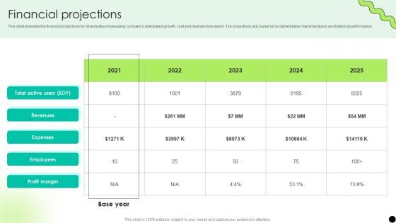 This slide presents the financial projections for bluestudios showcasing companys anticipated growth, cost and revenue forecasted. The projections are based on comprehensive market analysis and historical performance. Present like a pro with Financial Projections Digital Payment Platform Pitch Deck. Create beautiful presentations together with your team, using our easy-to-use presentation slides. Share your ideas in real-time and make changes on the fly by downloading our templates. So whether you are in the office, on the go, or in a remote location, you can stay in sync with your team and present your ideas with confidence. With Slidegeeks presentation got a whole lot easier. Grab these presentations today. This slide presents the financial projections for bluestudios showcasing companys anticipated growth, cost and revenue forecasted. The projections are based on comprehensive market analysis and historical performance.