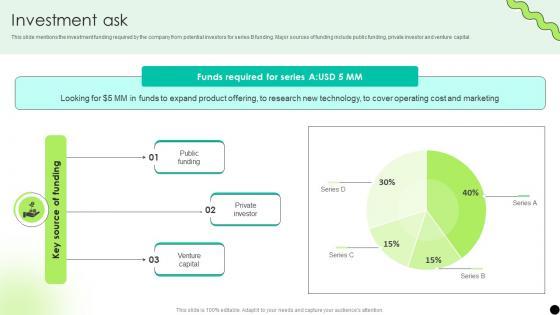 This slide mentions the investment funding required by the company from potential investors for series B funding. Major sources of funding include public funding, private investor and venture capital. Whether you have daily or monthly meetings, a brilliant presentation is necessary. Investment Ask Digital Payment Platform Pitch Deck can be your best option for delivering a presentation. Represent everything in detail using Investment Ask Digital Payment Platform Pitch Deck and make yourself stand out in meetings. The template is versatile and follows a structure that will cater to your requirements. All the templates prepared by Slidegeeks are easy to download and edit. Our research experts have taken care of the corporate themes as well. So, give it a try and see the results. This slide mentions the investment funding required by the company from potential investors for series B funding. Major sources of funding include public funding, private investor and venture capital.