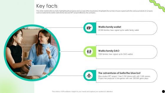 This slide mentions the key facts highlighting the progress and success of the bluestudios. It highlights the number of users signed up for the various products of company such as wallio family wallet, wallio family dao and NFT project offered by the company. Find highly impressive Key Facts Digital Payment Platform Pitch Deck on Slidegeeks to deliver a meaningful presentation. You can save an ample amount of time using these presentation templates. No need to worry to prepare everything from scratch because Slidegeeks experts have already done a huge research and work for you. You need to download Key Facts Digital Payment Platform Pitch Deck for your upcoming presentation. All the presentation templates are 100 percent editable and you can change the color and personalize the content accordingly. Download now This slide mentions the key facts highlighting the progress and success of the bluestudios. It highlights the number of users signed up for the various products of company such as wallio family wallet, wallio family dao and NFT project offered by the company.