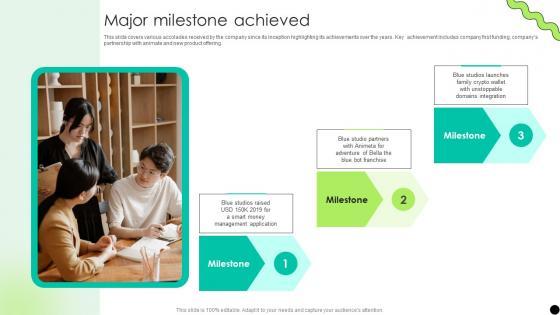 This slide covers various accolades received by the company since its inception highlighting its achievements over the years. Key achievement includes company first funding, companys partnership with animate and new product offering. If your project calls for a presentation, then Slidegeeks is your go-to partner because we have professionally designed, easy-to-edit templates that are perfect for any presentation. After downloading, you can easily edit Major Milestone Achieved Digital Payment Platform Pitch Deck and make the changes accordingly. You can rearrange slides or fill them with different images. Check out all the handy templates This slide covers various accolades received by the company since its inception highlighting its achievements over the years. Key achievement includes company first funding, companys partnership with animate and new product offering.