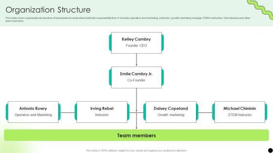 This slide covers organizational structure of bluestudios to understand authority-responsibility flow. It includes operation and marketing, instructor, growth marketing manager, STEM instruction, Web develop and other team members. Are you in need of a template that can accommodate all of your creative concepts This one is crafted professionally and can be altered to fit any style. Use it with Google Slides or PowerPoint. Include striking photographs, symbols, depictions, and other visuals. Fill, move around, or remove text boxes as desired. Test out color palettes and font mixtures. Edit and save your work, or work with colleagues. Download Organization Structure Digital Payment Platform Pitch Deck and observe how to make your presentation outstanding. Give an impeccable presentation to your group and make your presentation unforgettable. This slide covers organizational structure of bluestudios to understand authority-responsibility flow. It includes operation and marketing, instructor, growth marketing manager, STEM instruction, Web develop and other team members.