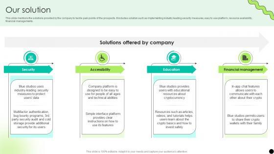 This slide mentions the solutions provided by the company to tackle pain points of the prospects. It includes solution such as implementing industry leading security measures, easy to use platform, resource availability, financial managements. Crafting an eye-catching presentation has never been more straightforward. Let your presentation shine with this tasteful yet straightforward Our Solution Digital Payment Platform Pitch Deck template. It offers a minimalistic and classy look that is great for making a statement. The colors have been employed intelligently to add a bit of playfulness while still remaining professional. Construct the ideal Our Solution Digital Payment Platform Pitch Deck that effortlessly grabs the attention of your audience Begin now and be certain to wow your customers This slide mentions the solutions provided by the company to tackle pain points of the prospects. It includes solution such as implementing industry leading security measures, easy to use platform, resource availability, financial managements.