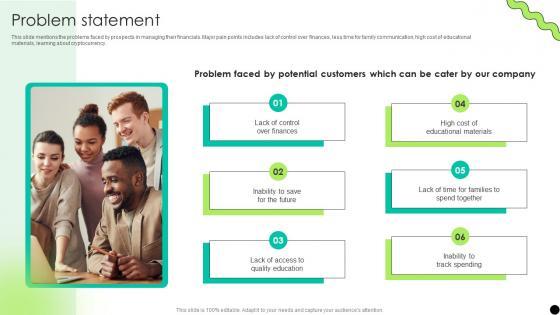 This slide mentions the problems faced by prospects in managing their financials. Major pain points includes lack of control over finances, less time for family communication, high cost of educational materials, learning about cryptocurrency. Make sure to capture your audiences attention in your business displays with our gratis customizable Problem Statement Digital Payment Platform Pitch Deck. These are great for business strategies, office conferences, capital raising or task suggestions. If you desire to acquire more customers for your tech business and ensure they stay satisfied, create your own sales presentation with these plain slides. This slide mentions the problems faced by prospects in managing their financials. Major pain points includes lack of control over finances, less time for family communication, high cost of educational materials, learning about cryptocurrency.