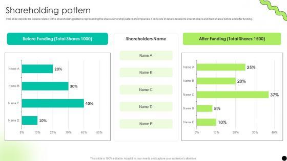 This slide depicts the details related to the shareholding patterns representing the share ownership pattern of companies. It consists of details related to shareholders and their shares before and after funding. This modern and well-arranged Shareholding Pattern Digital Payment Platform Pitch Deck provides lots of creative possibilities. It is very simple to customize and edit with the Powerpoint Software. Just drag and drop your pictures into the shapes. All facets of this template can be edited with Powerpoint, no extra software is necessary. Add your own material, put your images in the places assigned for them, adjust the colors, and then you can show your slides to the world, with an animated slide included. This slide depicts the details related to the shareholding patterns representing the share ownership pattern of companies. It consists of details related to shareholders and their shares before and after funding.