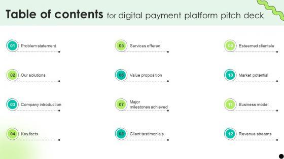 This Table Of Contents For Digital Payment Platform Pitch Deck is perfect for any presentation, be it in front of clients or colleagues. It is a versatile and stylish solution for organizing your meetings. The Table Of Contents For Digital Payment Platform Pitch Deck features a modern design for your presentation meetings. The adjustable and customizable slides provide unlimited possibilities for acing up your presentation. Slidegeeks has done all the homework before launching the product for you. So, do not wait, grab the presentation templates today Our Table Of Contents For Digital Payment Platform Pitch Deck are topically designed to provide an attractive backdrop to any subject. Use them to look like a presentation pro.