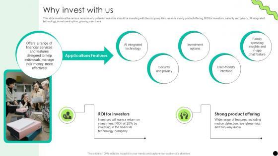 This slide mentions the various reasons why potential investors should be investing with the company. Key reasons strong product offering, ROI for investors, security and privacy, AI integrated technology, investment option, growing user base. Explore a selection of the finest Why Invest With Us Digital Payment Platform Pitch Deck here. With a plethora of professionally designed and pre-made slide templates, you can quickly and easily find the right one for your upcoming presentation. You can use our Why Invest With Us Digital Payment Platform Pitch Deck to effectively convey your message to a wider audience. Slidegeeks has done a lot of research before preparing these presentation templates. The content can be personalized and the slides are highly editable. Grab templates today from Slidegeeks. This slide mentions the various reasons why potential investors should be investing with the company. Key reasons strong product offering, ROI for investors, security and privacy, AI integrated technology, investment option, growing user base.