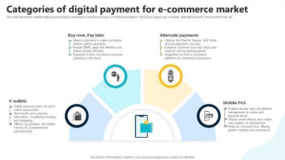 This slide exhibits the multiple digital payment options available for customers during e-commerce transactions. The various options are e-wallets, alternate payments, mobile point of sale, etc. From laying roadmaps to briefing everything in detail, our templates are perfect for you. You can set the stage with your presentation slides. All you have to do is download these easy-to-edit and customizable templates. Categories Of Digital Payment For E Commerce Market In Depth Guide To Digital Wallets Fin SS V will help you deliver an outstanding performance that everyone would remember and praise you for. Do download this presentation today. This slide exhibits the multiple digital payment options available for customers during e-commerce transactions. The various options are e-wallets, alternate payments, mobile point of sale, etc.