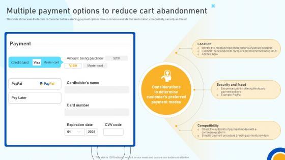 This slide showcases the factors to consider before selecting payment options for e-commerce website that are location, compatibility, security and fraud. Retrieve professionally designed Digital Marketing Strategies Multiple Payment Options To Reduce Cart Abandonment SA SS V to effectively convey your message and captivate your listeners. Save time by selecting pre-made slideshows that are appropriate for various topics, from business to educational purposes. These themes come in many different styles, from creative to corporate, and all of them are easily adjustable and can be edited quickly. Access them as PowerPoint templates or as Google Slides themes. You do not have to go on a hunt for the perfect presentation because Slidegeeks got you covered from everywhere. This slide showcases the factors to consider before selecting payment options for e-commerce website that are location, compatibility, security and fraud.
