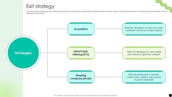 This slide outlines bluestudieos exit strategy providing investors with a clear understanding of potential events and return on their investment opportunities. Key strategies include acquisition, IPO and keeping company private. Get a simple yet stunning designed Exit Strategy Digital Payment Platform Pitch Deck. It is the best one to establish the tone in your meetings. It is an excellent way to make your presentations highly effective. So, download this PPT today from Slidegeeks and see the positive impacts. Our easy-to-edit Exit Strategy Digital Payment Platform Pitch Deck can be your go-to option for all upcoming conferences and meetings. So, what are you waiting for Grab this template today. This slide outlines bluestudieos exit strategy providing investors with a clear understanding of potential events and return on their investment opportunities. Key strategies include acquisition, IPO and keeping company private.